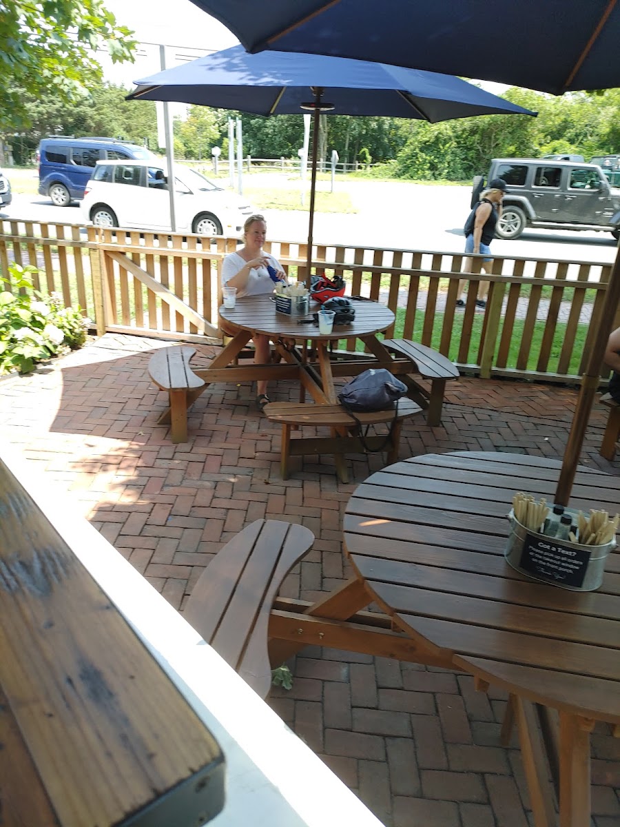 We came in early may and it was chilly outside. So we sat in the covered patio with heaters, it made the experience 10/10 because we got very warmed up. I got the shrimp po’boy and my mom got the Mahi tacos both delicious and great size! We both shared the clam chowder also yum! Everyone was kind and food came fast. We had our little dog with us on the patio. Will come back.