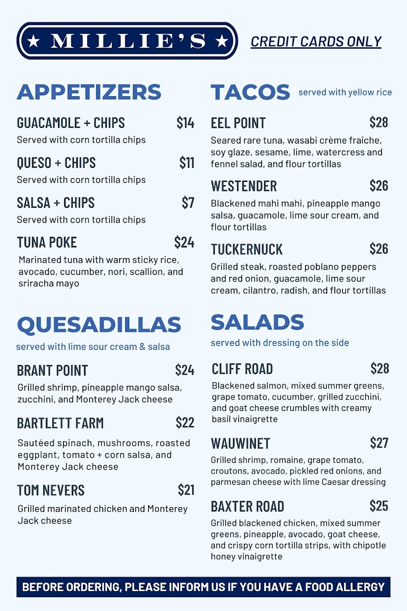 Welcome to Millie’s Mid-Island, a charming addition to Nantucket's dining scene, where the warmth of American comfort food meets the vibrant coastal atmosphere. Nestled at 1 Sparks Ave, this takeout-only eatery brings a fresh flair to familiar favorites, inviting locals and tourists alike to savor mouthwatering dishes crafted with care.