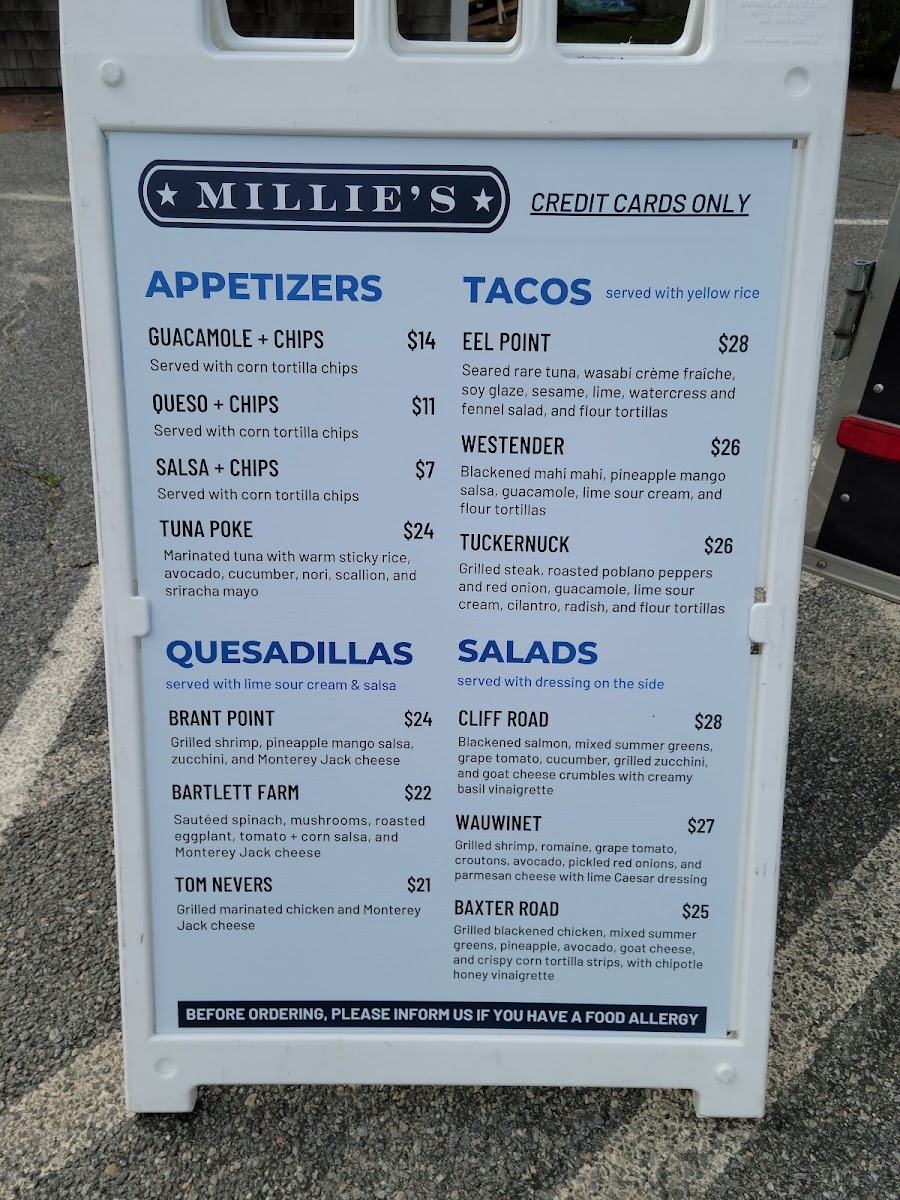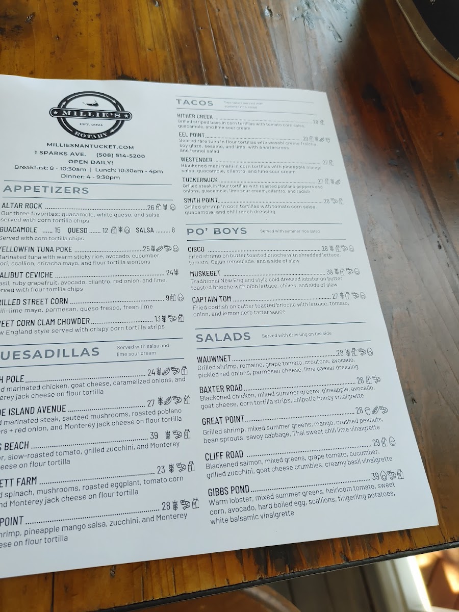 Welcome to Millie’s Mid-Island, an exciting new addition to Nantucket’s culinary scene! This American restaurant specializes in vibrant flavors and comfort fare, served exclusively for takeout. Located at 1 Sparks Ave, it's perfect for those craving delicious meals on-the-go. The menu boasts mouthwatering tacos, such as the Hither Creek with grilled striped bass and the Veggie Tacos bursting with sautéed spinach and roasted eggplant. Don't miss the grilled quesadillas, featuring marinated steak and chicken paired with Monterey Jack cheese. Salads like the Wauwinet, with grilled shrimp and zesty lime Caesar dressing, showcase fresh ingredients. The charming ambiance stands out, though keep in mind it's not a traditional sit-down experience. With a focus on speedy service and exceptional quality, Millie’s Mid-Island is set to impress locals and visitors alike. Whether indulging in a lobster roll or clam chowder, your taste buds are in for a treat!
